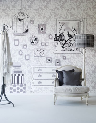 Kul idé med "prylar" på tapeten. Älskar stolen i förgrunden också. Är på jakt efter en sådan till min läshörna i vårt kombinerade gästrum/kontor.